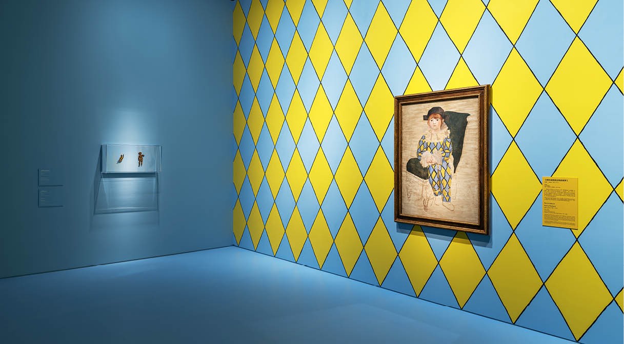 在“童年”展厅,作品自己成为展陈策画的一部分,保罗·史姑娘形容,这里是一处“儿童房”。《与玩物卡车玩耍的孩子》眼前,展墙铺开大片的深绿,与画中的绿色互相对话。《装璜成笑剧丑角的保罗》则跻身于蓝黄交错的菱形配景之中。这些作品呈现了毕加索创作中轻柔而富于象征的一面。毕加索一直将童年视为其创作中的中枢,儿童在他的创作中既是形容对象,亦然激励步地校正的进击源流。他借由儿童视角的天真与目田,从中索要新的线条与形骸步地,寻求解脱传统绘画范例的可能,“像孩子一样画画”成为赓续他艺术生存的内在愿望。