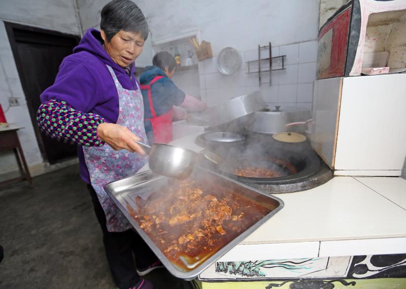“这叫‘㸆’,火候到了,胶原卵白都出来了,冷了当然就成‘冻’了。”淳厚傅告诉我,汤汁冷却后当然凝结成琥珀色的冻,这等于“猪头冻”名字的由来。看着老两口领略和解,灶膛火光映红脸庞,空气中满盈着浓郁的肉香,朱火明回忆起了儿时:“伯仲姐妹抢着添柴,就为灶头间的暖和,偷吃刚出锅滚热的肉,烫得直哈气……那技巧一年就盼这一口,咬上一小口冻,就一大口米饭,喷香!”