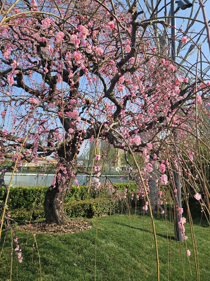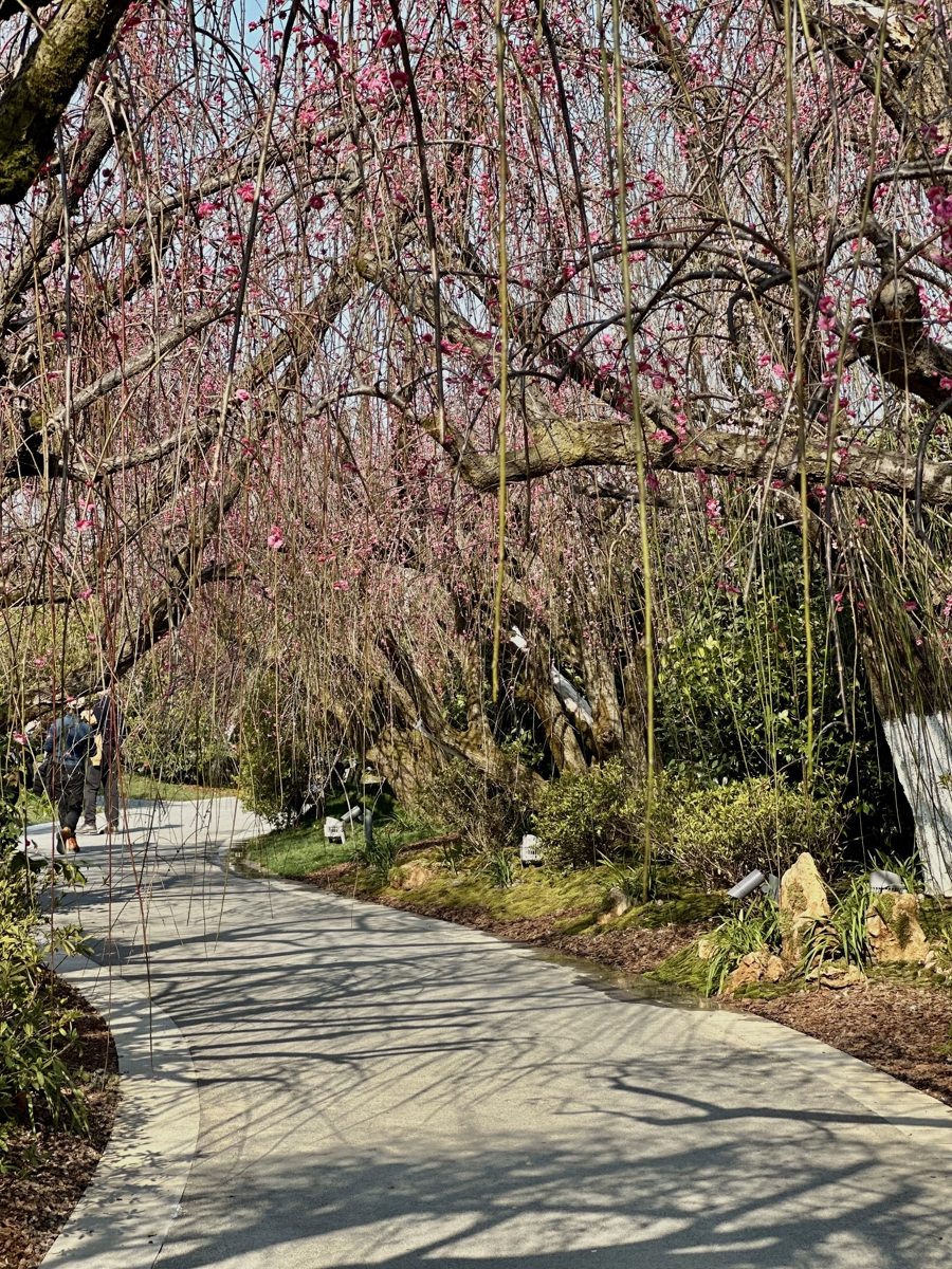 除了明星展品“梅王”,园内还有一条近百米的垂枝梅“合法”,两侧枝条如瀑流泻,交汇成花枝穹顶。走在小路上,满眼粉白、锦红与淡绿交汇,阵阵梅香沁鼻。据悉,这里每一株垂枝梅的口头都历程盆景专家的巧手,在种植时就像作念盆景雷同“拗造型”,因此才能有“虬枝遒劲”的不雅感。