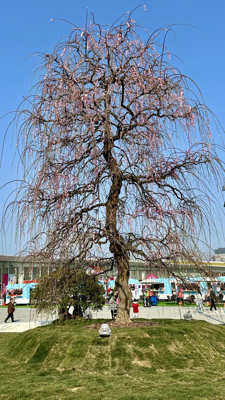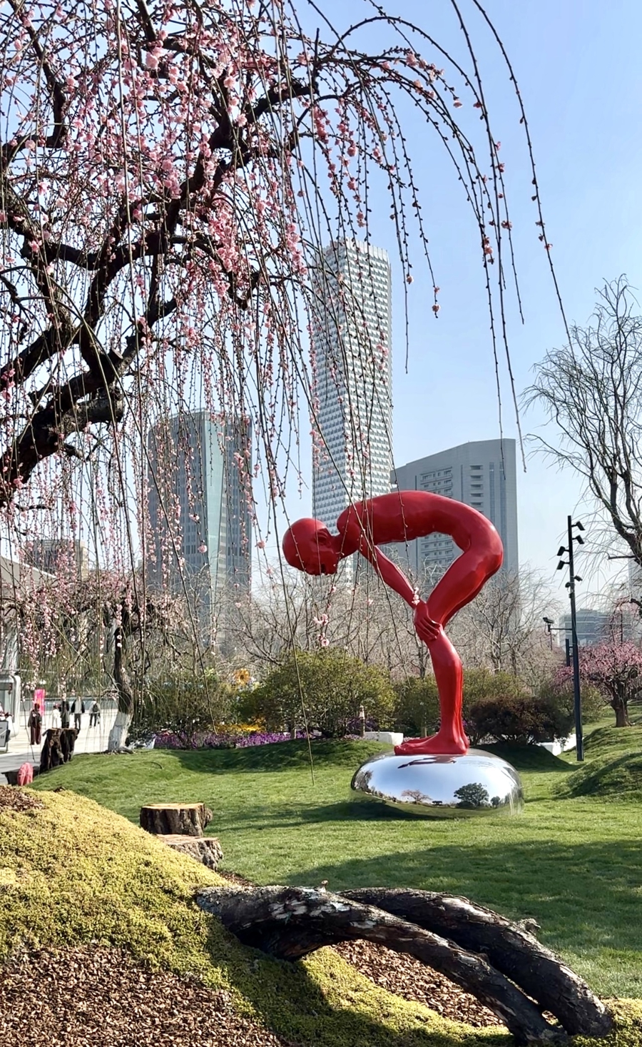 最吸睛的要数3层楼高的“梅王”。只见它的枝条纷纷垂下,最长的枝条有3.2米长,已有部分粉色重瓣的梅花在枝端摇曳。它的单株着花量瞻望达12000朵以上,亦然全场“花王”,盛花时将止境壮不雅。在它周围,放着一圈躺椅,不少旅客“躺平看花”,好不放心。