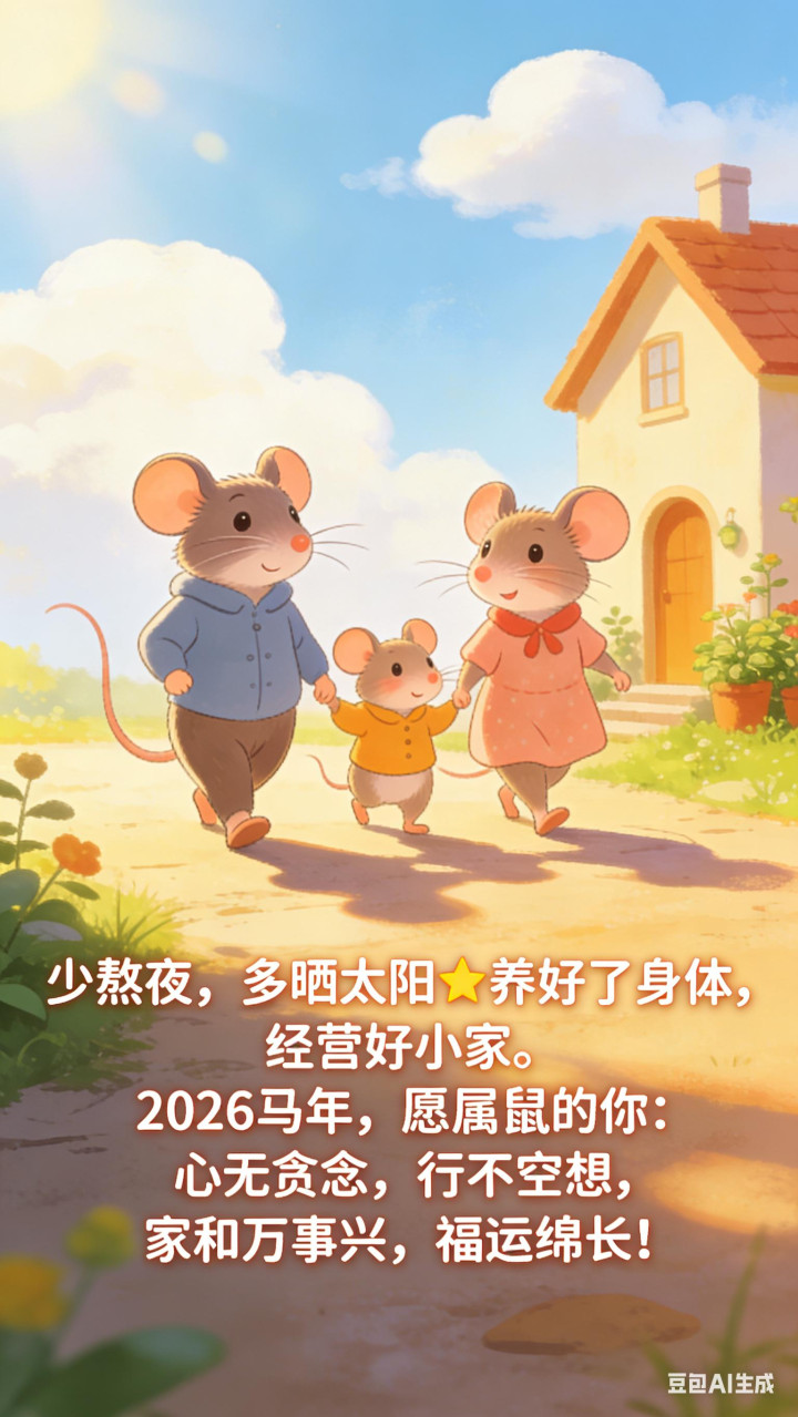 2026马年,愿统共属鼠一又友,守心守行、孝亲顾家,隔离贪欲与祈望,养好身心、稳住家运,全年吉祥唾手,福运绵长、家业兴旺!