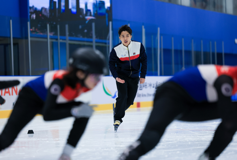 新华社像片,深圳,2026年1月9日,中国香港短说念速滑名将、香港速率溜冰学院实践董事朱定文(后)率领小畅通员训诲。