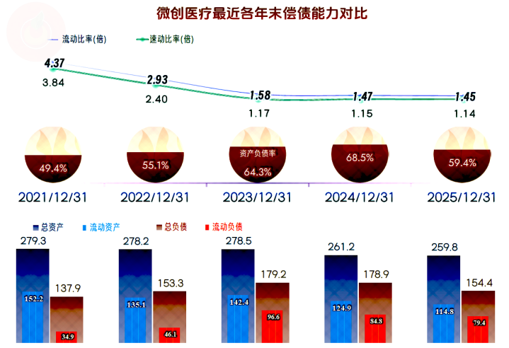 2025年末,微创医疗的钞票欠债率着落至六成傍边,由于握续“缩表”(总钞票着落)和2025年扭亏等变化,改善了握续着落的恒久偿债智商。短期偿债智商天然也不才降,但仍然是中等偏上的水平,最近两个年末,着落的幅度很小,算是在兼顾风险和收益的水平上稳住了。