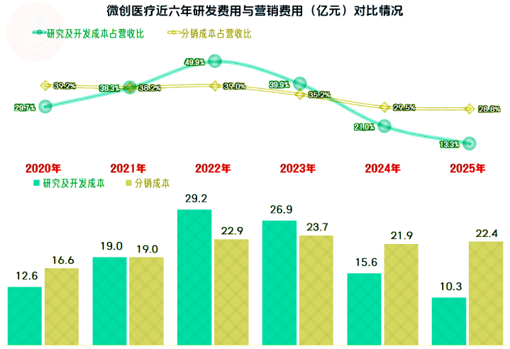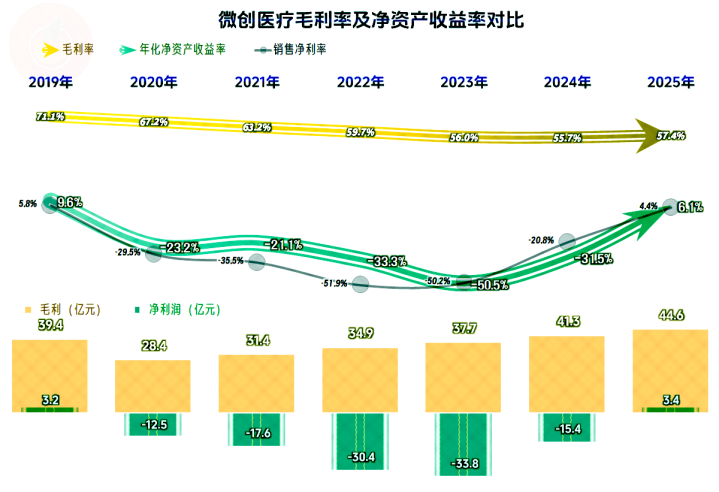 净利润的发扬就莫得营收那么好了,前五年王人在蚀本,2025年总算扭亏。由于微创医疗的整成成本用度结构相配复杂,咱们仅看其研发和营销用度,再加上毛利率,实验上也就看到了贸易成本。