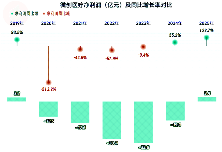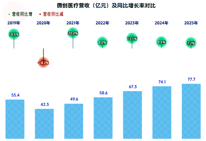 2025年,微创医疗的营收同比增长7.2%,不竭五年保握增长情景,五年累计增长接近翻倍。最近两年的增速王人不足10%,还有下滑的趋势,可以基本坚信,已流程了高速增恒久。
