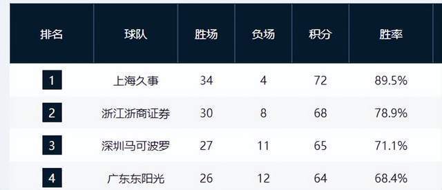 上海队以34胜4负的傲东谈主战绩稳居榜首,提前锁定惯例赛冠军,其19连胜的统率力号称本赛季最大亮点。广厦队以30胜8负紧随自后,位列第二,虽无缘榜首,小九体育在线直播官网但跨越上风清爽,基本锁定季后赛头号种子席位。