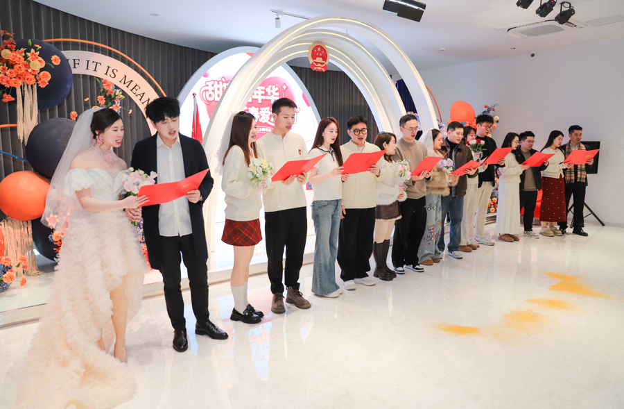 庆典上,8对新东谈主共同进入集体颁证庆典,宣读成婚誓词,并获赠杨浦“甜密经济”专属新婚贺礼。